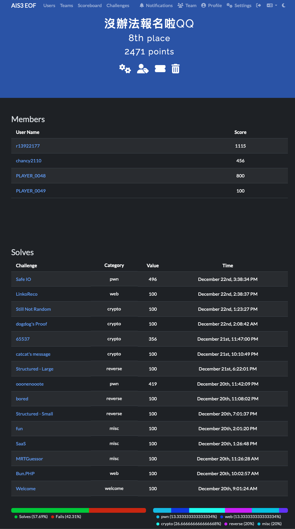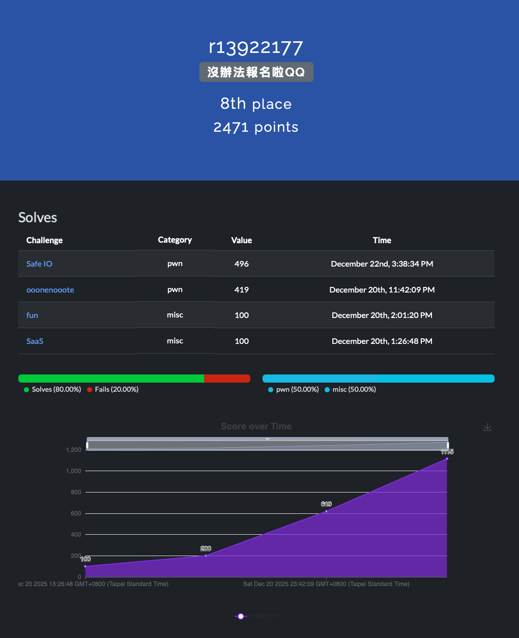 The figure above shows the challenges I solved. Luckily, this time I managed to gather 3 other teammates (compared to 2023, where we only had 2 teammates), so I was able to focus on pwn challenges. However, since I noticed that two misc problems hadn’t been solved by my teammates, I decided to try solving them myself.