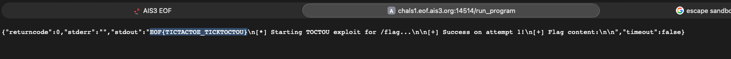 In summary, we can write a program to create two threads, Ta and Tb. Ta is responsible for constantly flipping the path buffer (which contains the target file path to read) between a legal file path (e.g., /etc/passwd) and /flag, while Tb keeps calling the open(path) function. If a race condition occurs in the order listed below, we will be able to read /flag: