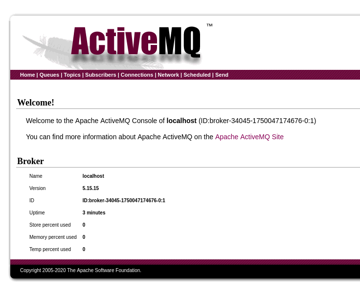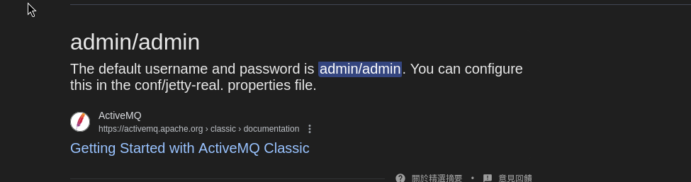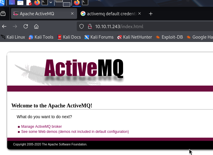 The first visit will required to enter the credentials. We may notice that the basic realm is ActiveMQRealm, we can search for the default credentials.