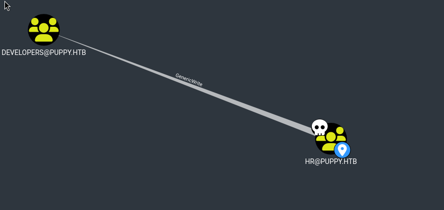 Note that we have levi.james credentials, and levi.james is a group member of HR@PUPPY.HTB. The HR group has GenericWrite access to the DEVELOPERS@PUPPY.HTB group.