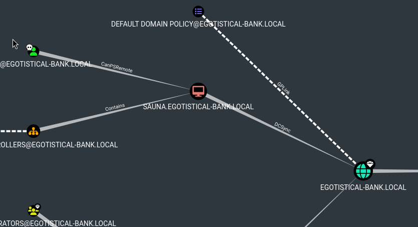 Note that if we own the SAUNA.EGOTISTICAL-BANK.LOCAL machine (which we currently have access to), we can abuse DCSync to dump domain user credentials!