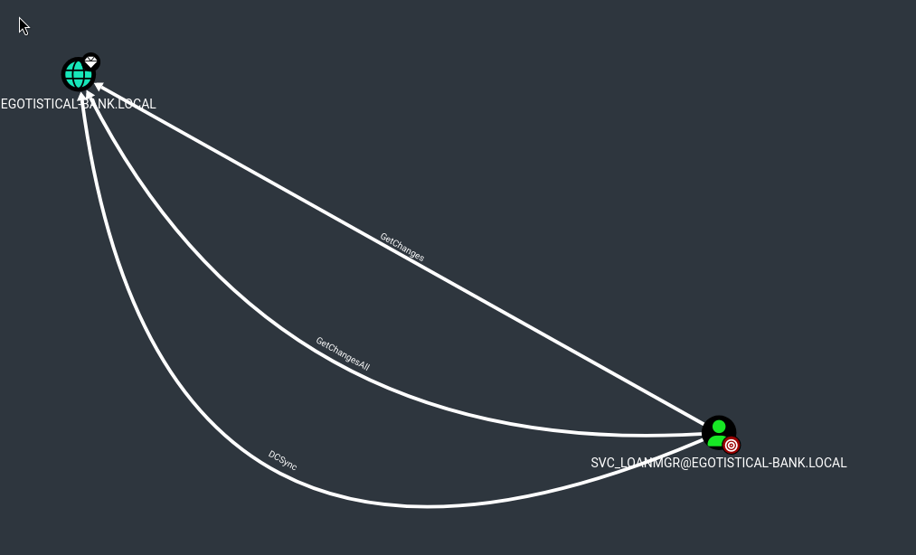 Another possible attack vector is svc_loanmgr, which has DCSync rights over the domain. If we compromise this account, we can abuse it.