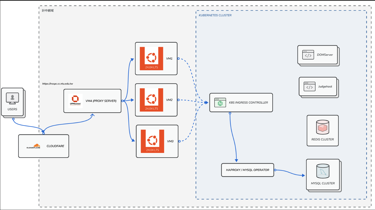 In previous years, everything was set up directly on VMs. This time, we decided to go with Kubernetes. VM-only setups get messy fast and are painful to reproduce; with Kubernetes, we can turn multiple services into a few config files, then deploy with one command. Plus, we get built-in knobs for high availability.