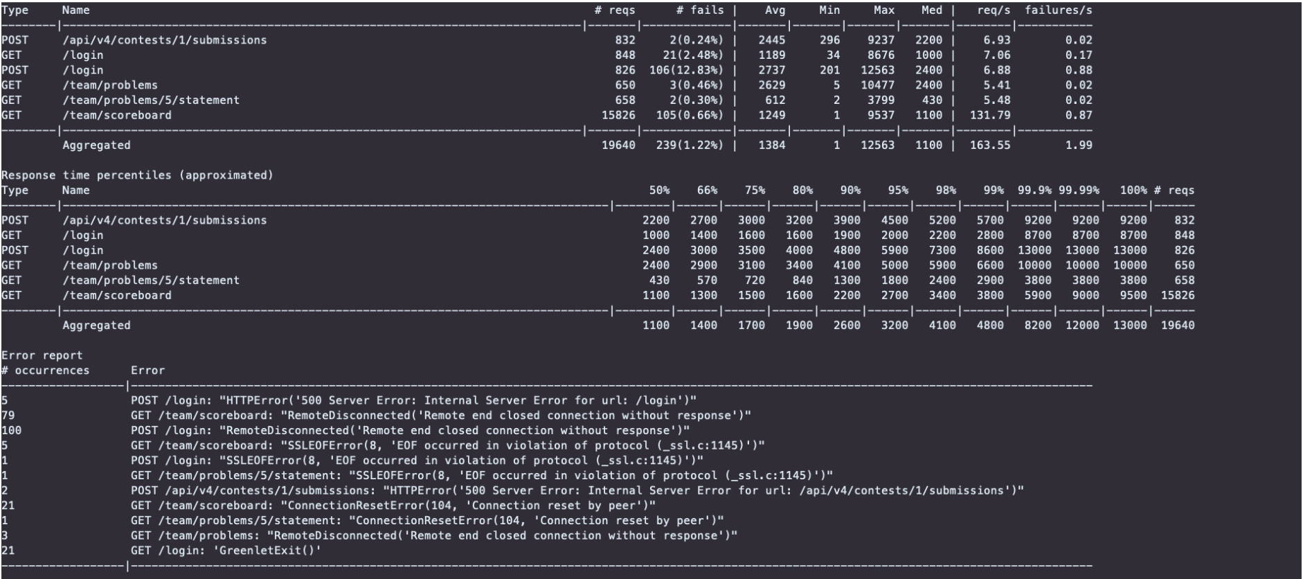 - Load test: Locust, simulating 800 concurrent users for 2 minutes